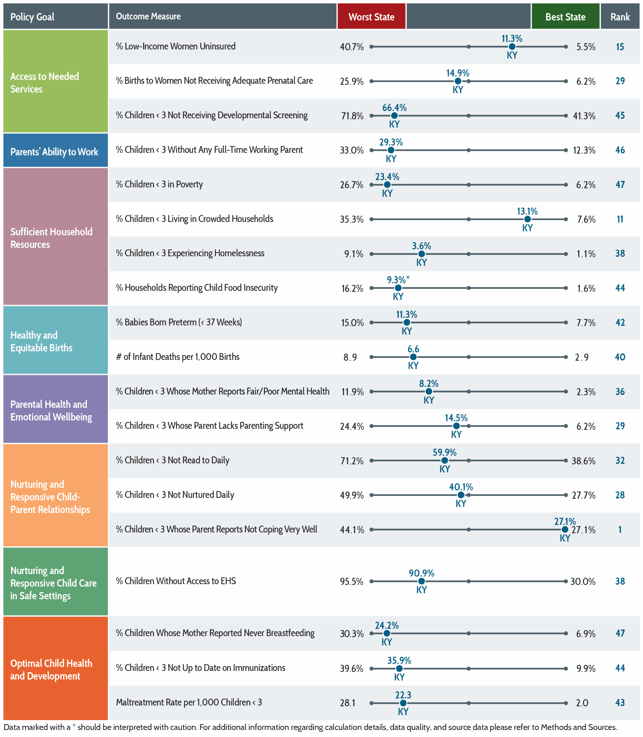 State policy choices influence the wellbeing of children and families. The data below illustrate the range on 19 outcome measures of child and family wellbeing between the state in which children and their parents are faring the best, and the state in which they are faring the worst and demonstrates where your state fits within that range. These data can help your state prioritize its prenatal-to-3 policy goals and track the wellbeing of children and families.