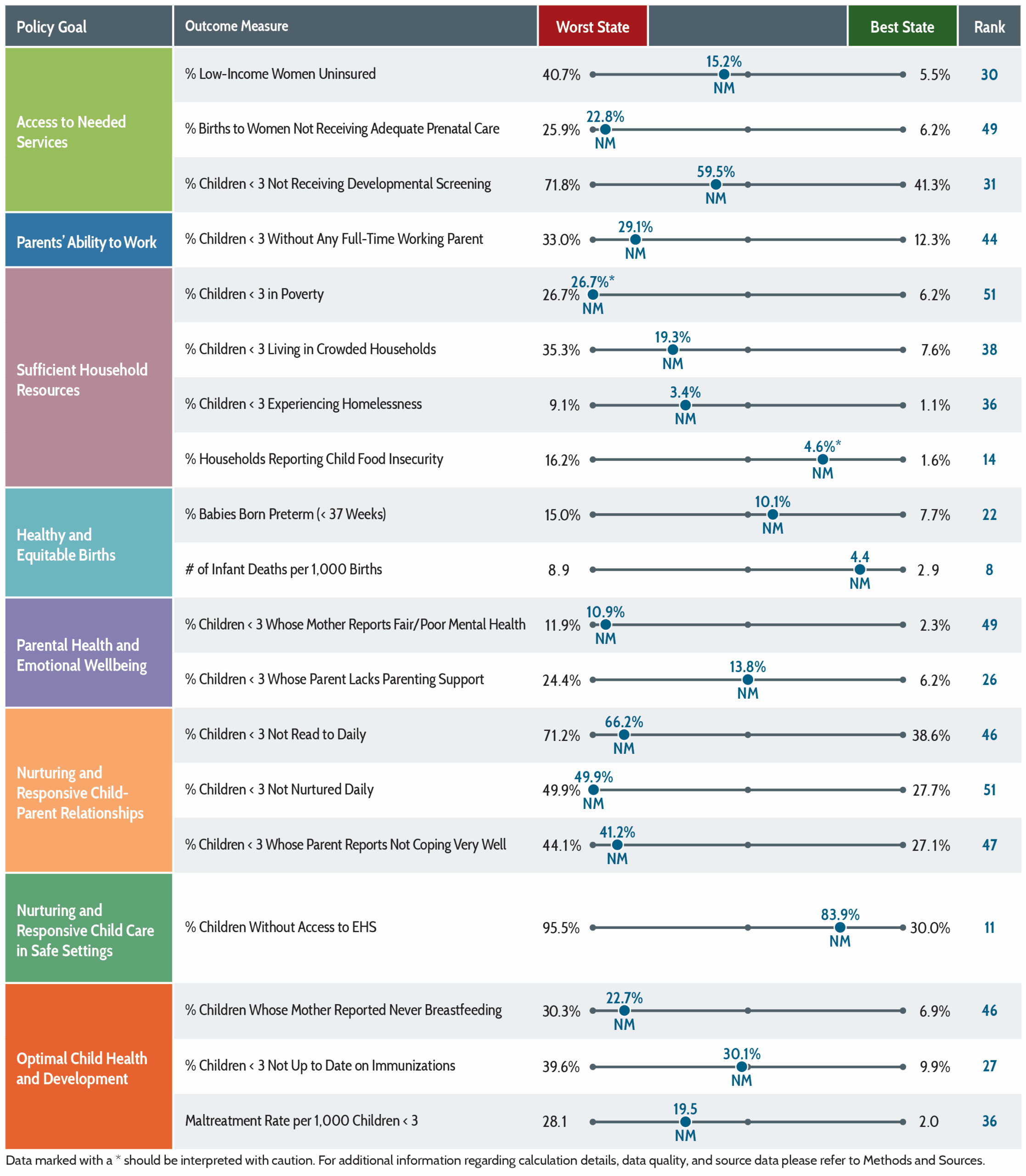 State policy choices influence the wellbeing of children and families. The data below illustrate the range on 19 outcome measures of child and family wellbeing between the state in which children and their parents are faring the best, and the state in which they are faring the worst and demonstrates where your state fits within that range. These data can help your state prioritize its prenatal-to-3 policy goals and track the wellbeing of children and families.